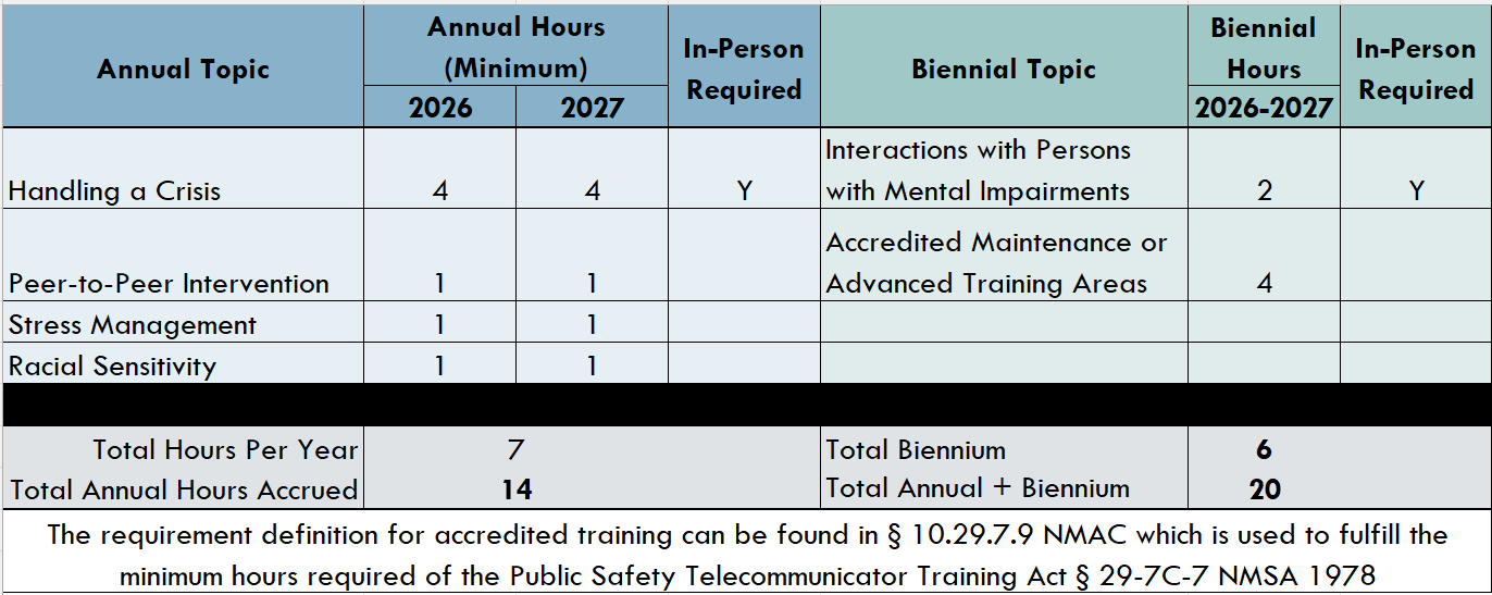 Please note that Public Safety Telecommunicators must still fulfill a minimum of 4 “Remaining training hours shall be in maintenance or advanced training areas to meet the agency’s specific needs and abilities of the telecommunicator” as described in §10.29.7.9, Paragraph A, Subparagraph (2) NMAC, by seeking NM Law Enforcement Certification Board-approved accredited courses pursuant to §29-7C-7 NMSA 1978.