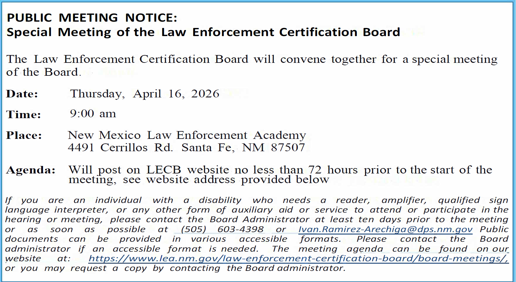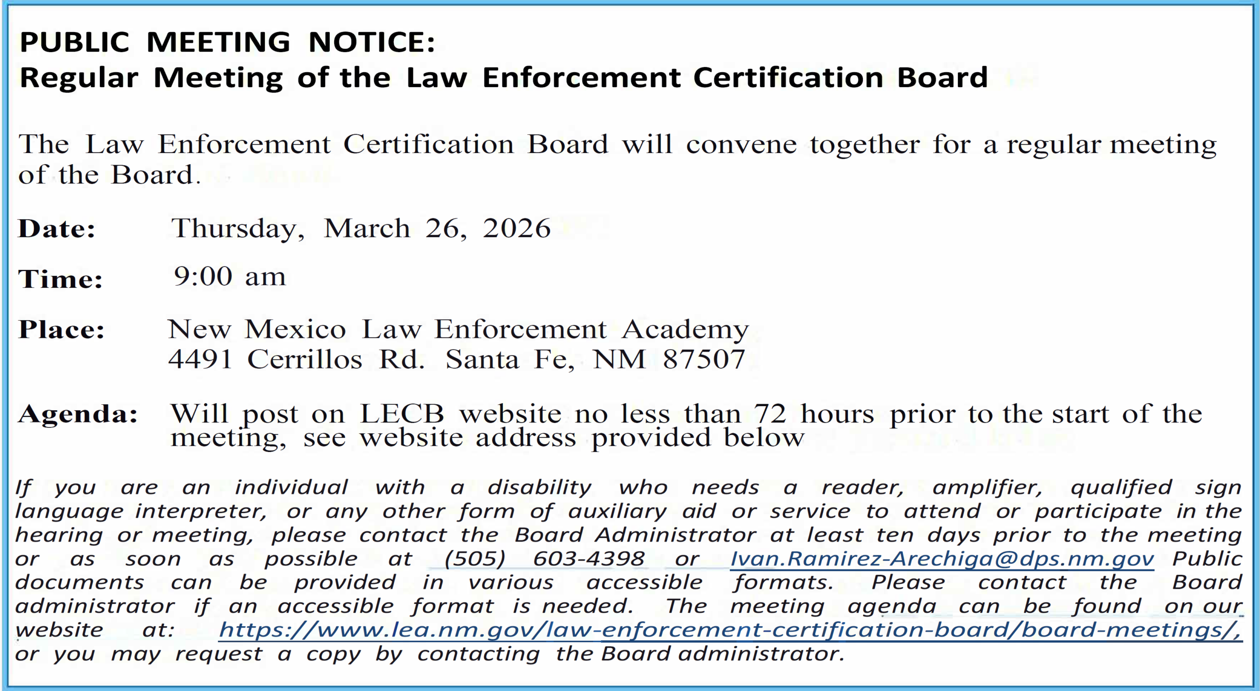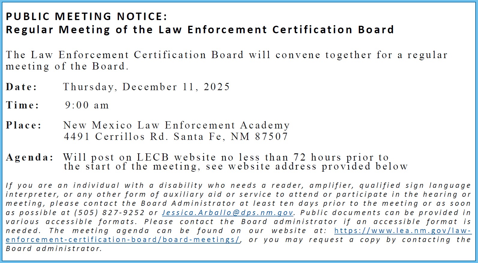 The board shall include the following members: (1) a retired district judge, who serves as chair of the board; (2) a current or retired New Mexico state-certified municipal law enforcement manager in a command position; (3) a retired sheriff who was certified or a current sheriff who is certified as a law enforcement officer; 4) a current or retired state or local New Mexico state-certified law enforcement officer who has law enforcement management command experience; (5) a current or retired tribal law, law enforcement officer; (6) a certified public safety telecommunicator; (7) an attorney in private practice who practices as a plaintiff’s attorney in the area of civil rights or who represents criminal defendants; (8) an attorney in private practice who represents public entities in civil rights claims; (9) an attorney who is employed by the public defender department; (10) a professor of criminal justice at a public post-secondary educational institution in New Mexico; and (11) a citizen-at-large who has knowledge and interest in law enforcement training.